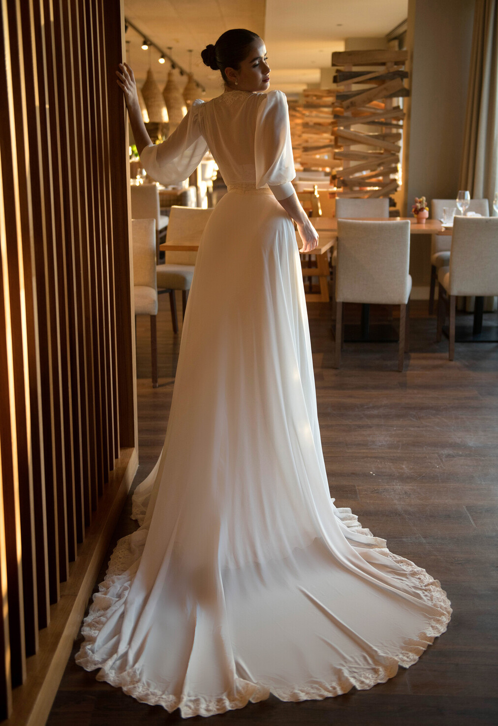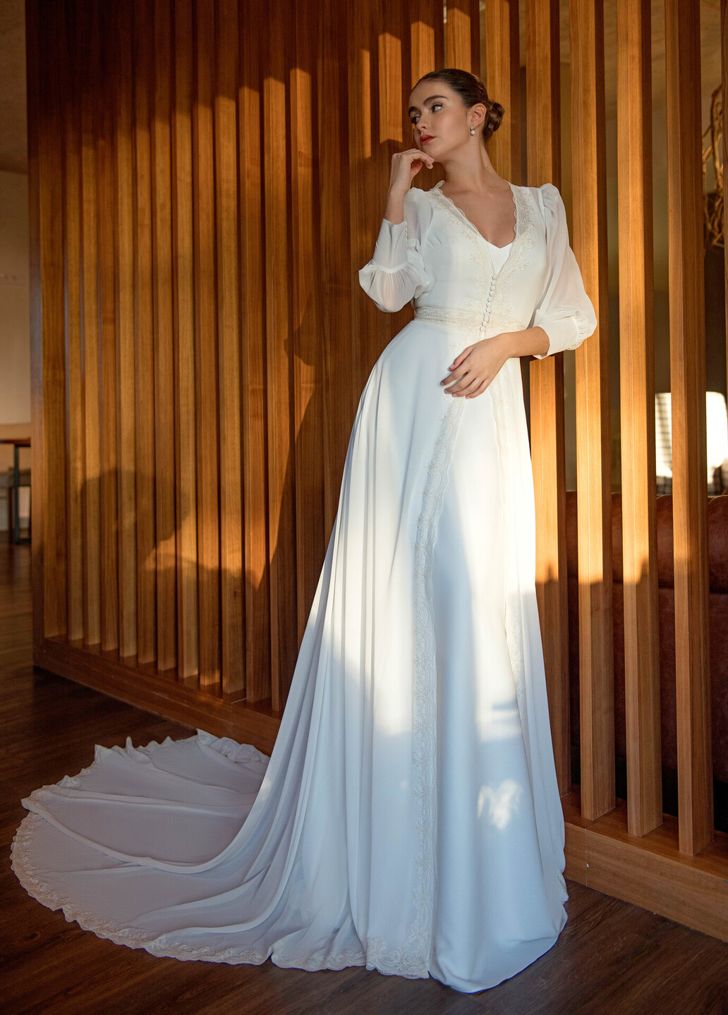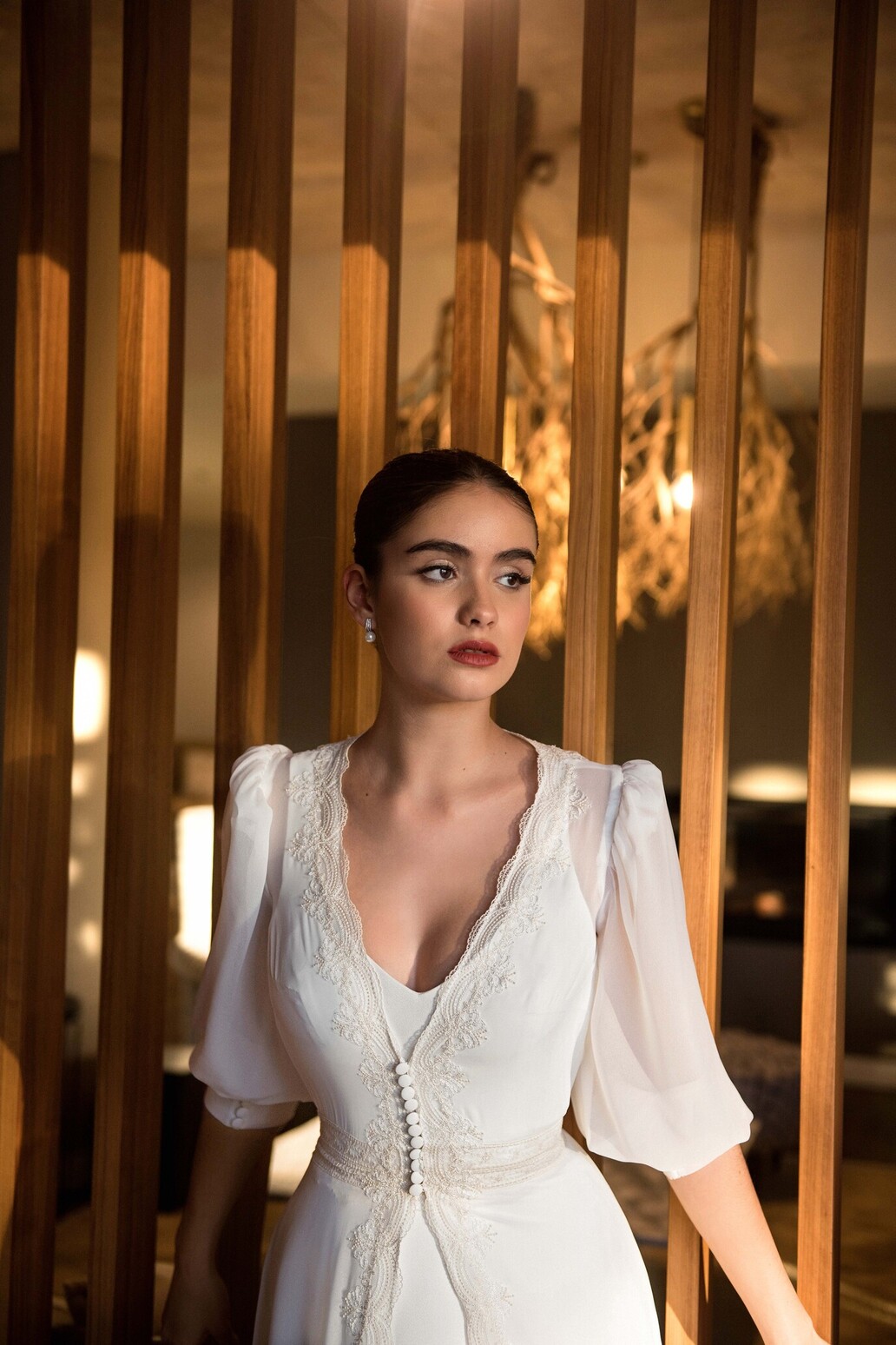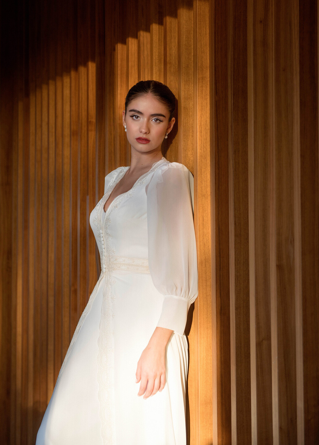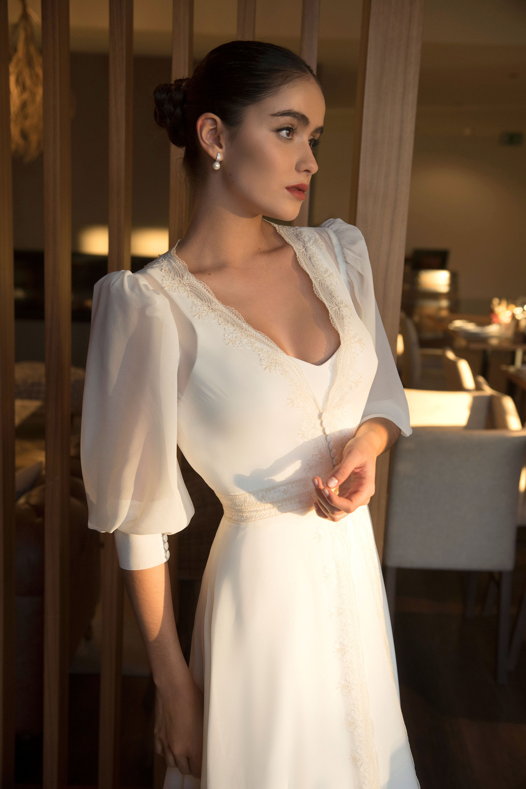 A capa do modelo 308, confecionada em mousseline e renda nos tons marfim e bege, foi pensada para complementar o vestido com fluidez e movimento.