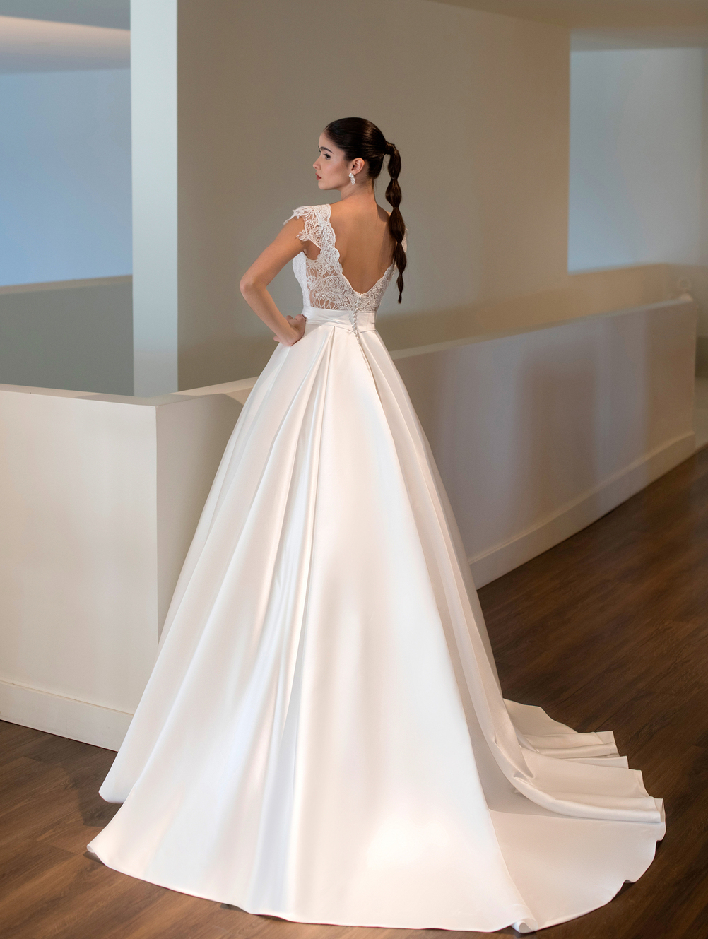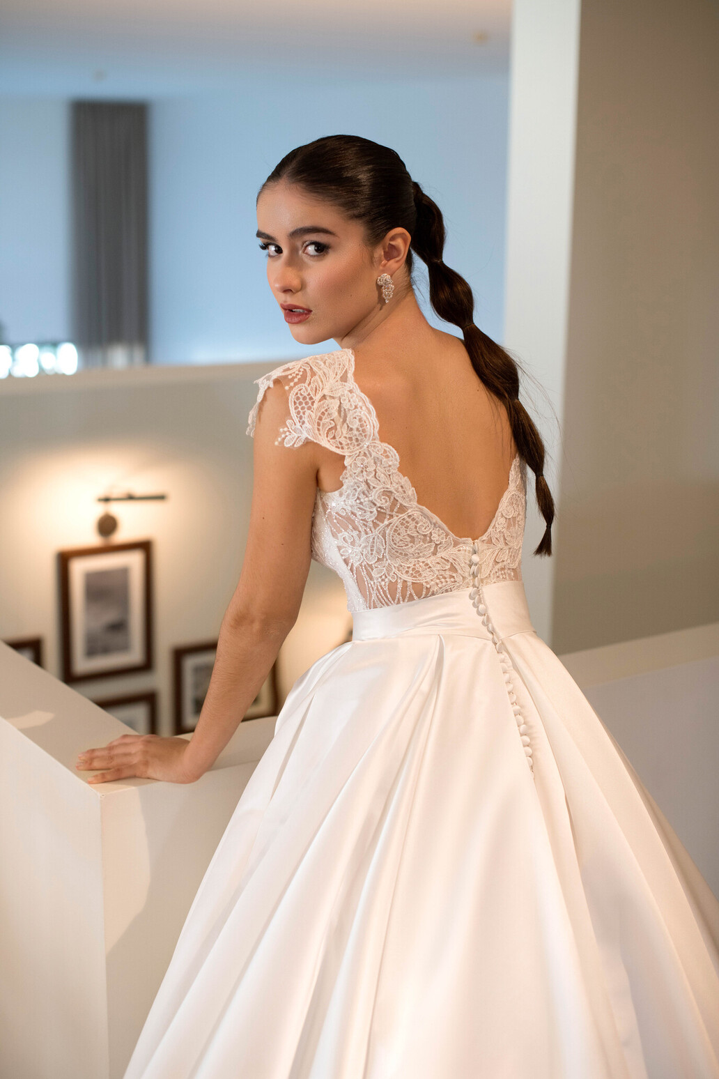 Confecionado em cetim e renda, destaca-se pelas aplicações delicadas no corpete e pela saia volumosa, que confere fluidez ao caminhar e um toque cenográfico ao visual.